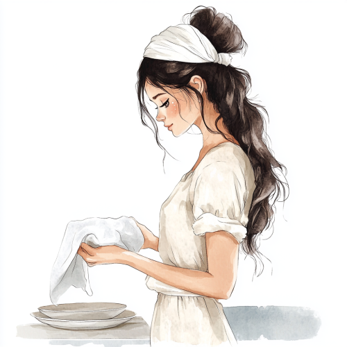 high detailed watercolor clipart of a beautiful girl folding laundry, dark thick long hair pulled into a bun and tied with a white headband in a bow, beautiful soft makeup, standing and wiping dishes, holding a tea towel and a plate, ,wearing comfortable home clothes, side view, the whole silhouette can be seen, soft white colors, beautiful illustrations with realistic details, high resolution, gray background