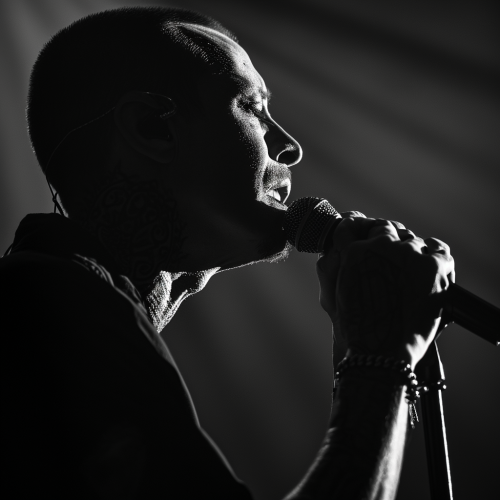 medieval knight singing rock into a microphone dark clouds with blue lightning in the air. --ar 16:9 --c 30