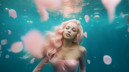 a full body shot of a happy blonde haired mermaid swimming in water with scale colours of light pink cotton candy, light acquarium blue, glistening champagne, and glimmering silver --ar 16:9 --v 5.0