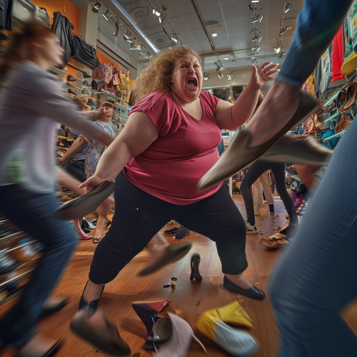 generate a photo inside women shoe shop of an angry chubby woman throwing her shoes at an employee, make the genrated photo looks like it's taken from a mobile while the action happens, make it look realistic. --v 6.0