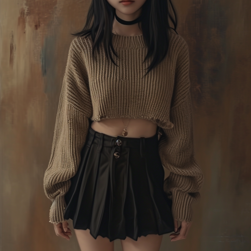 girl wearing short black skirt and light brown cropped sweater sweater, 2k, heperrealistic , shot with iphone, --v 6.0