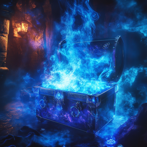 A magical chest releases blue magical light that engulfs the room like smoke as it opens up to reveal unknown magical powers in the dark dungeon room, artistic, colorful with darkness surrounding it, 3000x3000pixels, cover art