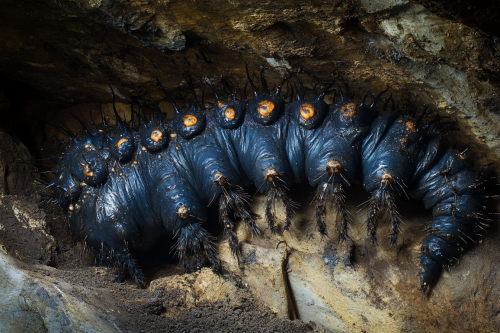 large dark blue d&d monster consisting of five segments. Every segment has multiple legs and six eyes. the monster is seen on the roof of a cave --ar 3:2