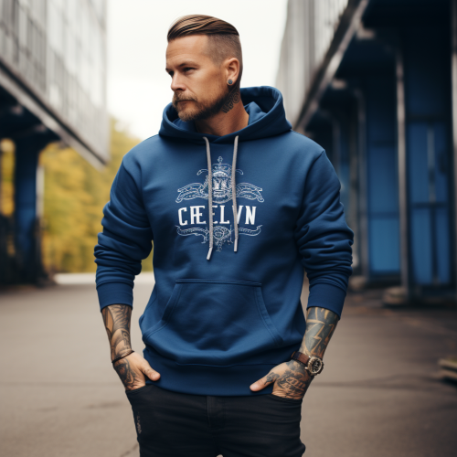 high tier hoodie marine blue colour with the word "Crew" with dark background