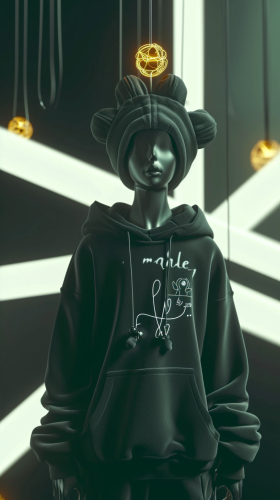 a hoodie with oversized sleeve, waist length, in the style of athleisure, with text "made by ai" written in mono typeface, subtle lighting, hyper realistic, --weird 100 --ar 9:16 --v 6.0