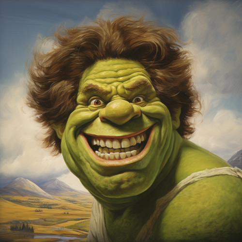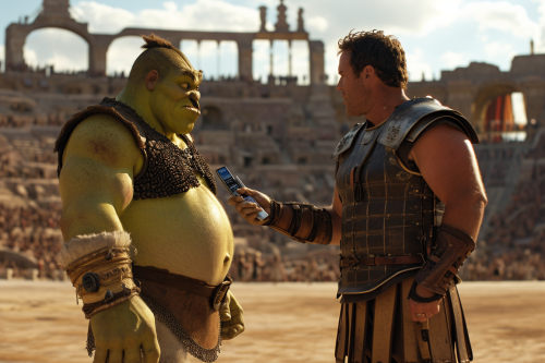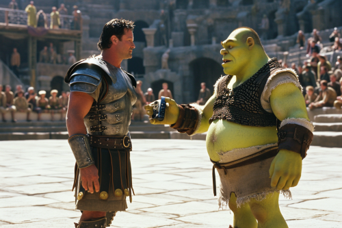 Wide shot of GLADIATOR handing a TV remote control to SHREK. Both characters are located in the center of the scene face to face and are in full length on the arena of a Roman coliseum. Actor Russell Crowe is GLADIATOR who wears his gladiator suit, the same one he wears in the original film. SHREK wears a brown vest and brown pants, the same outfit from the original film. The background cinematic setting has the visual style set in the GLADIATOR movie. The stands of the coliseum are full of typical characters from the SHREK movie. The scene is a captivating mix of past and present, artfully crafted by Wes Anderson, Erwin Olaf and Ivan Aivazovsky. Photography on 35 mm film, high resolution, realistic, wide angle, cinematic, raw style, --ar 3:2 --v 6.0