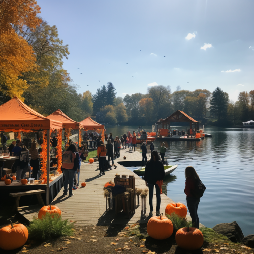 a college-aged woman in an orange hoodie, standing on the bottom of a grass hill where it meets a lake, and is playing with a remote control boat