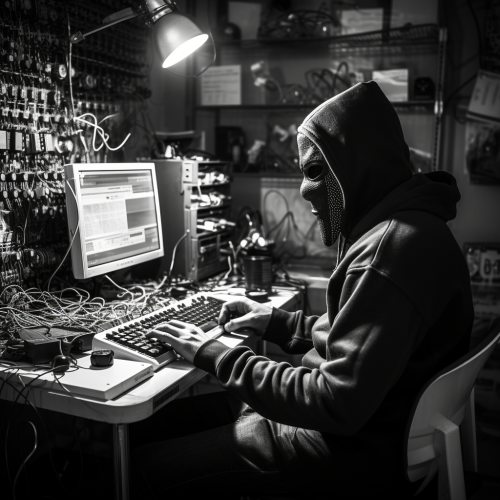 hacker controling machin in remote, falt design, black and white