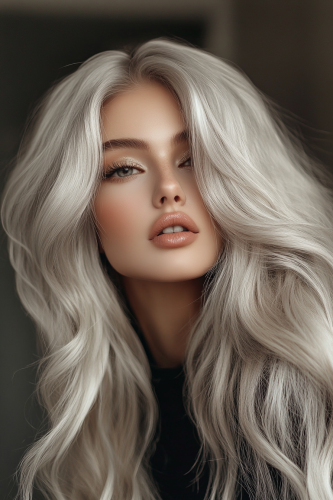 luxurious photo of an instagram model posing for the camera. she has big fake lips and silicone implants. her hair is ery long, silver blonde and has extra volume and it is shiny and perfect. the background is a professional hair salon. the picture captures her whole body and emphasizes all the features. --ar 2:3 --style raw