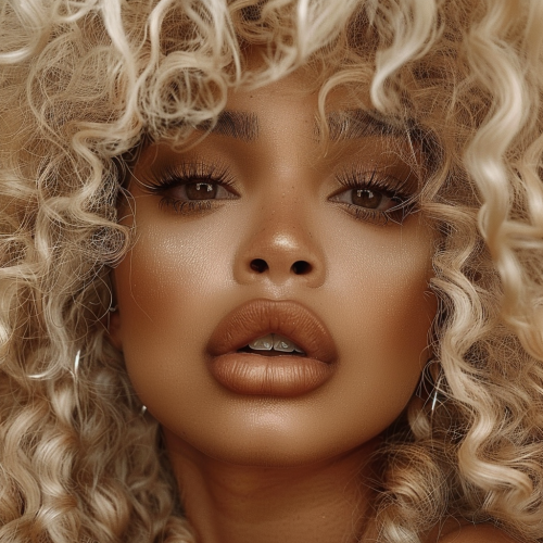 The image shows a person with voluminous curly blonde hair and facial features that suggest cosmetic enhancements. The lips appear full and pronounced, and the skin has a tanned appearance with some visible textural irregularities. The individual's makeup is notable, with defined eyeliner and mascara on the lashes, and they are wearing hoop earrings. kidak