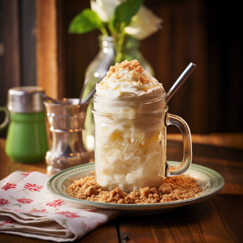 In a nostalgic 1960s-style kitchen, a thick and creamy Apple Pie Shake sits in a mason jar on a rustic wooden table. Nearby, a fresh apple crumble hints at its key ingredient. Vintage kitchenware and sprinkles of cinnamon complement the old-timey ambiance, showcasing the shake's rich flavors in a setting of bygone days.