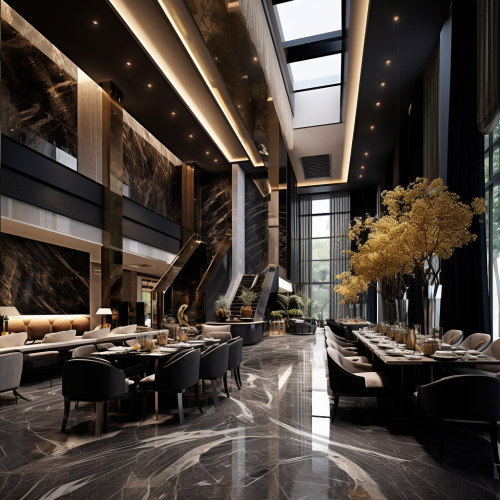 interior design of restaurant, classy, grey marble floor, wall to wall high glass windows all around, V shaped floor plan, open interactive kitchen, black leather classy italian black ebony dining chairs, black ebony dining tables, amazing modern ceiling, floating ceiling, crystal pendant suspended lights, ultra rich mood, ultra luxury, luxe, lots of black, gold accents, Ultra HD, photorealistic, real, black ceiling, gold lighting in suspended black ceiling, mood