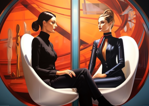Portrait of two glamour women with flirting attitude in a futuristic interior. oil on canvas. Contemporary art. James bond girls. Very detailled faces. --ar 70:50