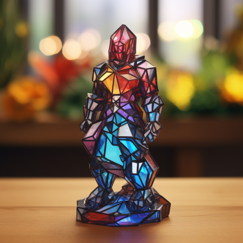 A small crystal figurine of a generic DnD character that looks like its made of stained glass