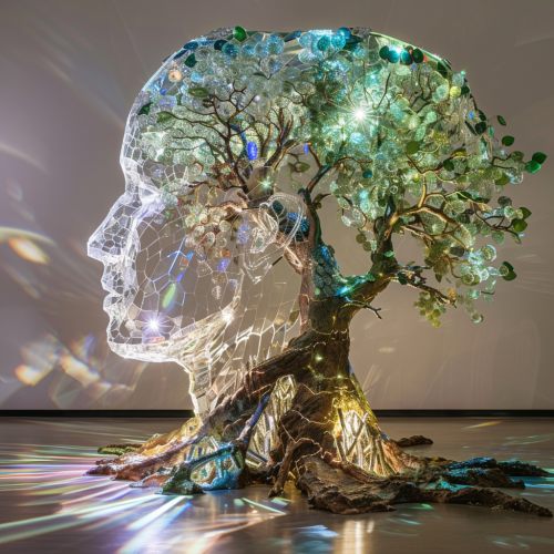 tree of knowledge from a ground level point of view, towering over the viewer with roots of the tree spreading outwards along the ground. The tree is made of a faceted crystalline glass structure with LEDs emanating within. The leaves are made from colored crystal structures and the tree is superimposed inside a human head.