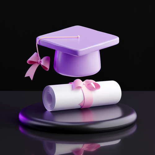 An icon of an exchange, a cute, purple cap with a pink ribbon on the left side, a white diploma roll in front of it, a 3D blender render, clay material, plain black background, studio lighting. app LOGO --v 6.0