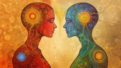 Draw a photorealistic picture of a standing full body figure of a man and a woman facing each other. Color-code the chakras in both bodies. Draw a golden flowing energy at the belly level of the 3rd chakra from the woman to the man, which represents the theft of energy. --ar 16:9
