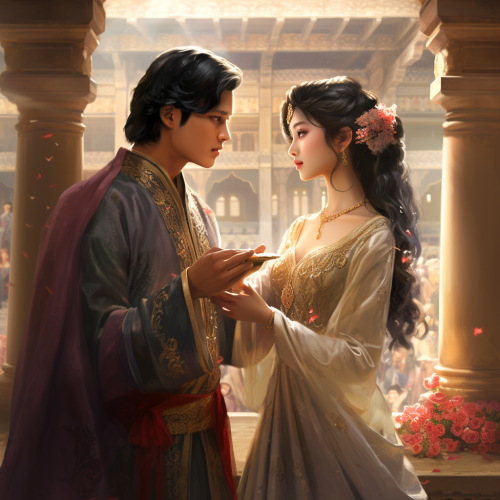 Asian men and women look at each other and exchange lovely eyes The background is the palace