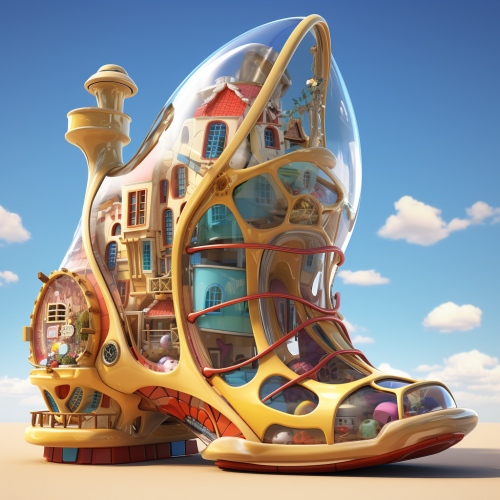 Picture a person wearing a shoe in the shape of a house, complete with windows, doors, and other house elements. This futuristic and imaginative concept adds a fun twist to traditional shoe design. The scene is rendered in a highly detailed 3D style and can be featured in a product design context.