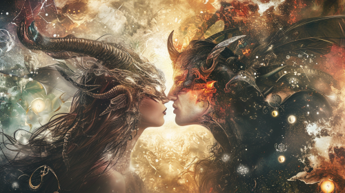 In a celestial realm, a devil shares a bittersweet kiss with a benevolent holy figure, the kiss illuminated by a soft celestial glow, surrounded by floating orbs of light and heavenly symbols, conveying a paradoxical blend of darkness and divine connection, Artwork, digital painting, --ar 16:9 --v 6.0