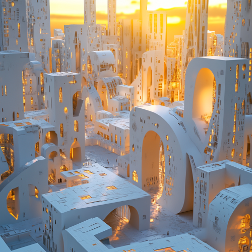 A city dedicated to teaching the English language, with buildings shaped like giant letters of the alphabet. The streets are white and clean, creating a sleek, modern environment. The sunset bathes the city in warm, golden hues, casting dramatic shadows across the letter-shaped buildings, while the overall atmosphere feels both educational and inspiring, symbolizing learning and creativity.