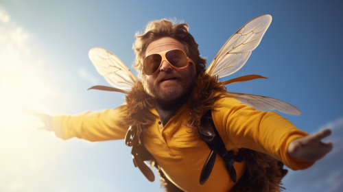 zach galifianakis morphed into a flying photorealistic bee from the bee movie. The background is soft and defocused but a sunny day. photorealistic, cinematic, editorial photo --ar 16:9
