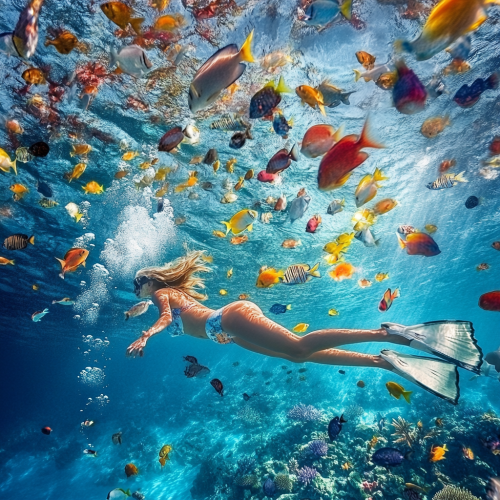 woman swimming underwater by a school of colorful fish in the Caribbean ocean. Underwater photography. Award winning National Geographic photo. --v 6.1