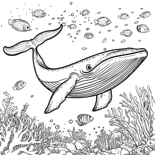 Cartoon illustration design. Baleen whale. Only one whale is shown in the center. Eyes like a Disney cartoon character. Side view. In the sea. Full of tropical fish. Coloring pages for children. Black and white.
