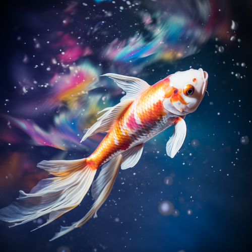 one koi fish swiming through the air raimbow background mid action hiper realistic photo qualaty