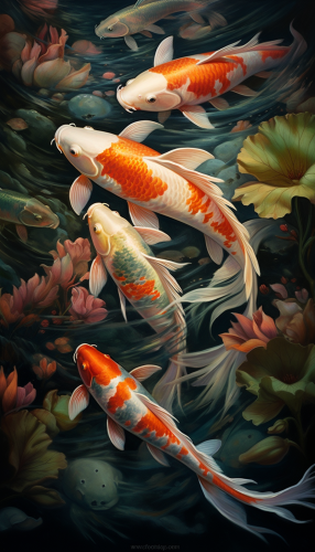 flat graphic design like trees with flat monochromatic colors. With glowing realistic gold fish swimming around them, casting a glow over the scene. --ar 4:1