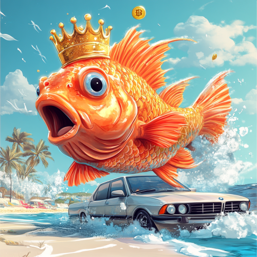 very slick and cool character called Floppin Groper, is an orange fish, king of the pond , cartoon with a BMW and bitcoin in the background, gold crown on the fish head, background the beach