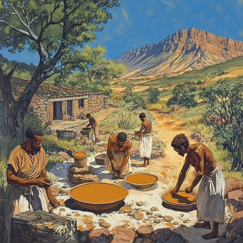 a painting of a group of ancient africans using rhassoul clay powder in ancient south africa. it is glistening because of how healthy it is. it is in a beautiful south african environment