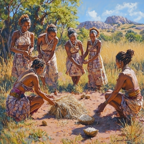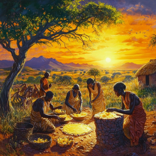 a painting of a group of ancient africans using shea butter in ancient south africa. it is glistening because of how healthy it is. it is in a beautiful south african environment
