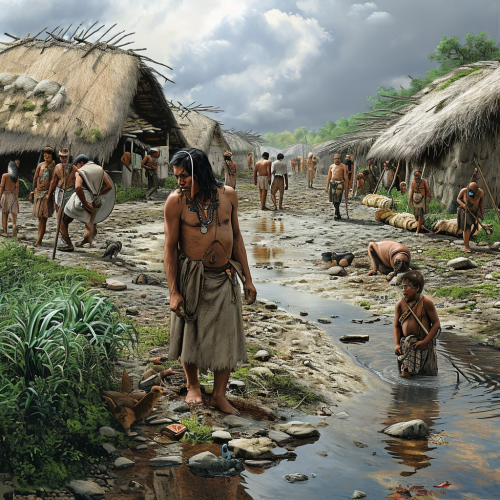 e a photo realistic image of ancient south americans going about their duties in their community ,-- 9:16- --v 6.0