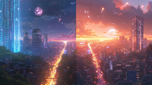 Vibrant anime-style illustration of an Information Nexus: A breathtaking, character-free cityscape of pure data and digital energy. Crystalline towers of swirling information rise into a technicolor sky, their surfaces alive with flowing streams of vibrant data and animated infographics. Each building is a different shape - cubes, pyramids, spheres - all pulsing with glowing circuits and cascading code. At the city's heart, a colossal, shimmering orb of pure information hovers, tendrils of light connecting it to every corner of the metropolis. Waves of data in electric blue, cyber pink, and neon green ripple outward from this central nexus, creating a mesmerizing pattern across the urban landscape. The streets below are rivers of binary code, crossed by bridges of pure light. Instead of trees, holographic cherry blossoms made of floating bits of code line the data streams, their petals scattering digital information. Massive holographic screens float in the sky, displaying ever-changing graphs, charts, and data visualizations. Beams of light shoot between buildings, transferring information at the speed of light. Style: Hyper-colorful anime aesthetic with clean, crisp linework and cel-shaded coloring. Extreme color saturation using a palette of electric blue, hot pink, cyber green, and radiant yellow. Dynamic, energetic composition with exaggerated perspective. Blend of 2D anime art style with some 3D rendered elements for the data effects. Highly detailed cityscape with intricate, futuristic architecture. Dramatic lighting with vibrant lens flares and digital sparkle effects, --ar 16:9 --v 6.0 --style raw --s 750