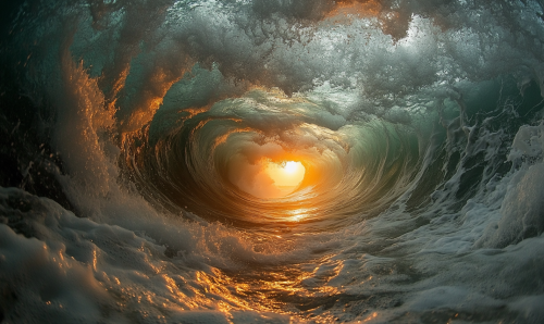 A huge wave, the water was blue and turquoise, and the waves splashed everywhere. The sun was shining outside, and the picture was taken from inside the barrel with a wide-angle lens. ben thouard. --ar 5:3 --style raw --stylize 750 --v 6.1
