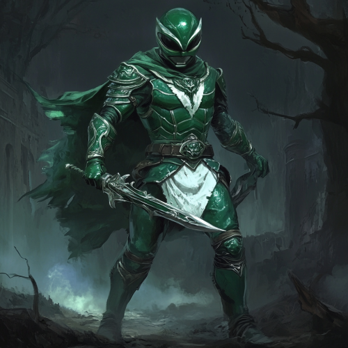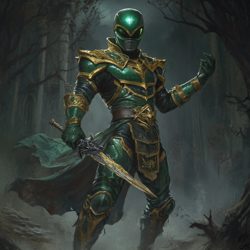 the Green Power Ranger from Mighty Morphin Power Rangers, reimagined in a medieval fantasy world inspired by Elden Ring. He stands in a dynamic, battle-ready pose, gripping a small, finely detailed Dragon Dagger, a very tiny short blade, fitting tightly in one hand. His armor is a mix of green and gold, worn leather, with intricate design, and a billowing cape adds to his imposing presence. The environment behind him is a dark, foggy medieval landscape with ancient ruins and twisted, barren trees. The lighting is eerie and dramatic, capturing the grim, epic mood of a dark fantasy world, akin to the haunting style of Elden Ring's environments.