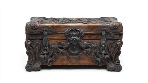 A highly detailed image of an ancient-looking treasure chest set against a plain white background. The treasure chest has an ornate, weathered design, with intricate carvings, metallic accents, and signs of age, as if it has been hidden in ruins for centuries. The wood is dark and slightly cracked, and the metal bands are rusted, adding to the antique appearance. The chest is partially open, hinting at hidden riches inside. The plain white background isolates the chest, drawing attention to its mysterious, relic-like presence. Created Using: high-resolution photography, realistic textures, cinematic lighting, detailed textures, relic-style design --ar 16:9