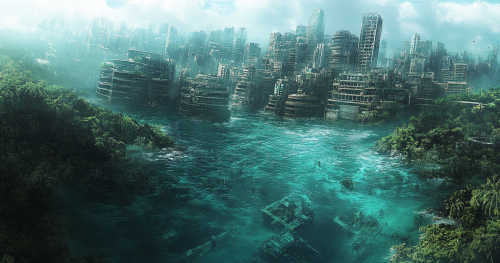 A sprawling sci-fi waterborne city, Esadale is half above water, and half below, adapted for both terrestial and amphibious life. Due to it's proximity with the Jungles it is a favored hub for research companies exploring the ocean's trenches as well as the riches of the jungles. Wide shot at the waterline showing both the buildings underneath the water and above. Mass Effect concept art style. --ar 21:11