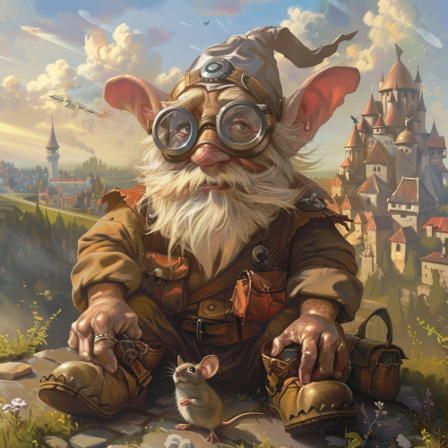 a dungeons and dragons character. It is a male forest gnome, that is also an articifer. The gnome is old and has a length of 3.1 ft and wears pilot goggles on his eyes. The gnome also wears dutch clogs. A little mouse is next to the gnome. The background is an open field with a big medieval city in the distance. Fantasy style image