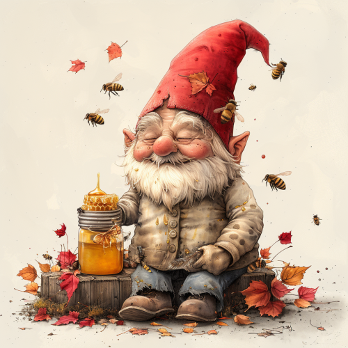 happy cute gnome with too big hat, honey and bees, child drawing, colorfull --no eyes --stylise 750 --chaos 30