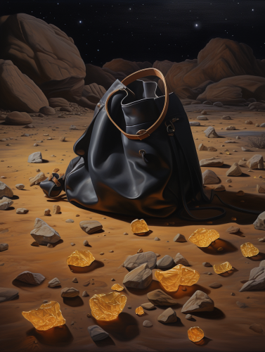 draw, a open leather bag with 3 yellow gold nuggets,Seen at a 45-degree angle, with a background in a nighttime desert --ar 3:4
