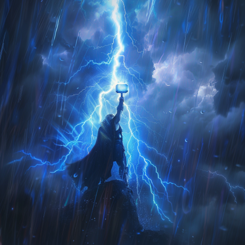 Thor in the sky striking a huge bolt of blue and yellow thunder down to the ground holding his hammer shouting, realistic, cinematic image and grade, high detail, movie still. Rain, moody. --v 6.0