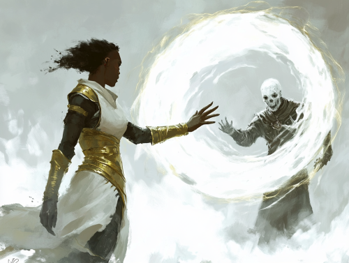 An undead/zombie is being banished by a female dark-skinned battlemage in a simple, elegant plate mail with a white tabard with gold trims. The banishing spell is seen as a large white and gold portal enveloping the undead/zombie. Fantasy RPG setting, wide angle. --v 6.1 --ar 4:3