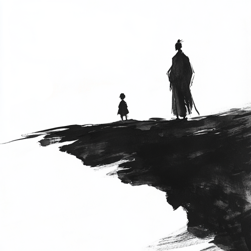 Create a minimalist ink sketch illustration, black on white background, with ample white space surrounding the scene. Show the wise sage and the child standing side by side at the edge of a cliff, gazing into the distance. The sage stands calmly, hands behind his back, and the child looks out with a sense of awe. Use simple, expressive brush strokes to evoke a feeling of quiet reflection and the end of a journey, focusing on the bond between the sage and the child. Ensure generous white space around the sketch to create an open, contemplative atmosphere.