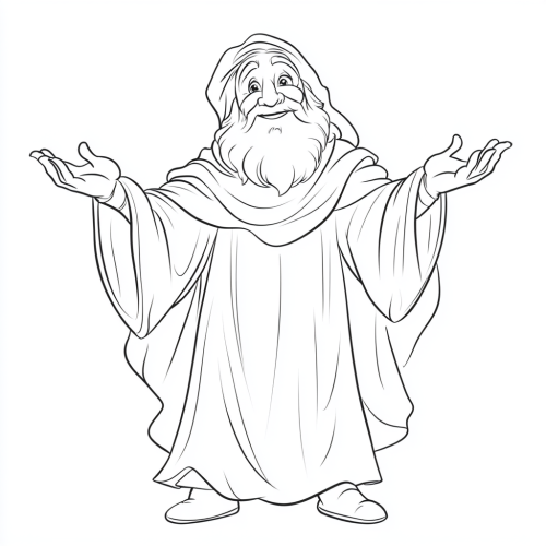 A very tender and loving figure of God as an elderly, wise man with a warm smile and gentle eyes, depicted in a simple, child-friendly style, with flowing robes and a peaceful aura, arms open wide as if welcoming, soft lines, no gray tones, black and white only, designed for a coloring page, suitable for children aged 4 to 10, conveying warmth, safety, and love, Catholic theme