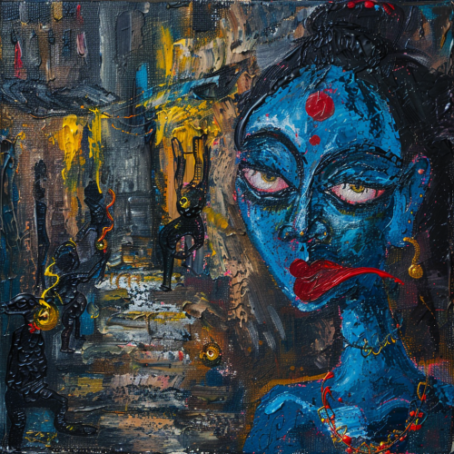 acrylic on rough canvas painting. Goddess kali is walking down a dark, lonely street. Her skin is blue and has large red bindi on her forehead and her hair is dishevelled and her red tongue is out. In the alley, a few shadowdy figures of men with glowing eyes are looking at her. Scoops and smears of paint, palette knife. --v 6.0