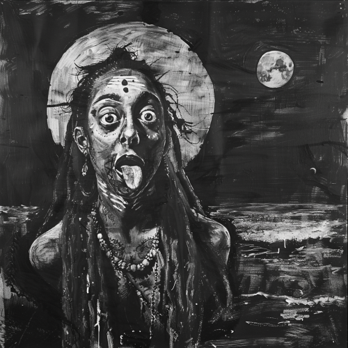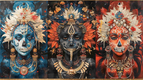 Acrylic on canvas painting of Goddess Kali in triptych style. Three distinct panels showing Kali's different moods: calm, ferocious, and smiling. Left panel: Calm Kali in deep blue, serene expression, minimal jewelry. Center panel: Ferocious Kali in black, multiple arms, protruding tongue, wearing a garland of skulls. Right panel: Smiling Kali in vibrant red, benevolent expression, holding a lotus. Each panel should have visible brush strokes and canvas texture. Background should be darker shades of the main color in each panel with subtle sacred geometry patterns. Consistent artistic style across all panels, reminiscent of neo-tantric art. Sharp focus on Kali's face in each panel. Studio lighting to highlight the acrylic paint's texture. 8K resolution, ultra-detailed. --ar 16:9 --stylize 1000 --v 6.0