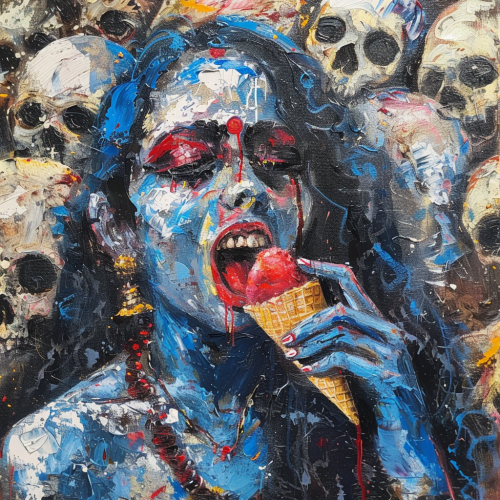 acrylic on rough canvas painting of goddess kali. Her skin is blue and hair dishevelled and she has a large red bindi. She is sitting on top of a pile of skulls and bones and enjoying an icecream cone with her red tongue sticking out. Even the ice-creams scoop in the cone is bright red. Scoops and smears of paint are rough and visible, palette knife. --v 6.0