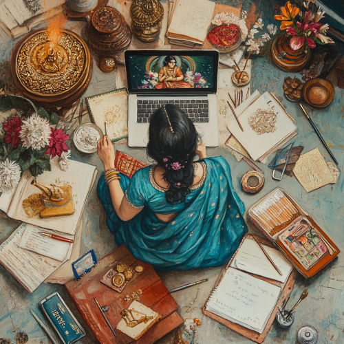 A woman in a blue sari, sitting on the floor with her laptop , surrounded by stationery items like pens, papers, books, flowers,sweet dish and a golden pot filled by gold coin (a traditional Indian confection) from India. She is painting of the goddess Lakshm, from a top-down perspective, in an illustrative art style.
